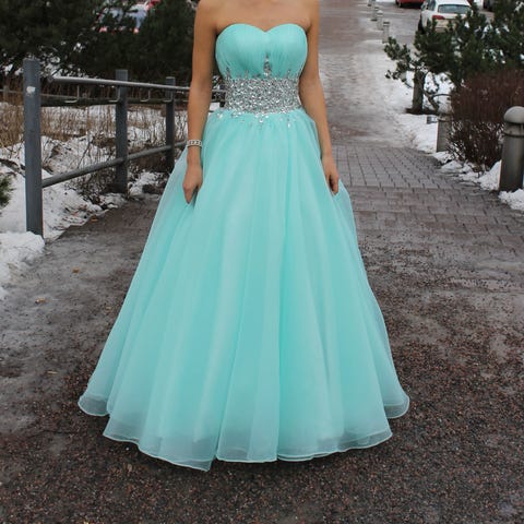 Zazabellan vanhojenmekko koko 32. Mukaan vannehame. Kerran tanssittu, uutena ostettu. Kuvassa näkyy helman vaurio.