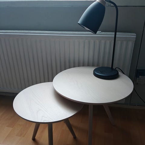 Jonkin verran käytönjälkiä mutta yleisilmeeltään siistit pöydät. Voidaan laittaa erilleen tai vaikka peräkkäin. Menevät myös sisäkkäin joten vievät tällöin vähän tilaa ja ovat helppo kuljettaa. Nouto Knuutilankankaalta.