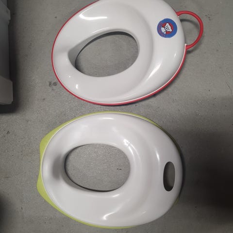 Ikean Tossig wc-pöntön supistaja vihreillä silikonireunoilla sekä valkoinen Orthexin supistaja