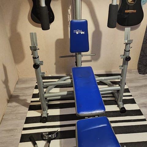 Kuntopenkki lihaskuntoharjoitteluun. Penkissä on musta-harmaa pehmustettu istuin ja selkänoja, joka tukee erilaisissa lihaskuntoharjoitteissa. Rungossa on metallinen kehikko ja tukijalat. Selkänoja on säädettävissä.
