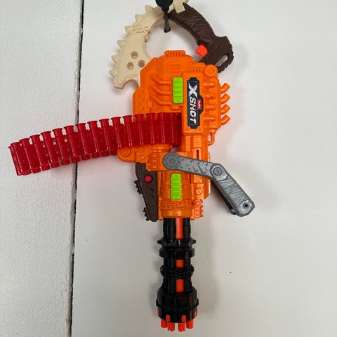 X-Shot Insanity Motorized Rage Fire leikkiase. Aseessa on 40 ammuksen hihna, joka pyörii automaattisesti sen läpi. Toimii 6xAA paristoilla. Mukaan reilusti ammuksia.