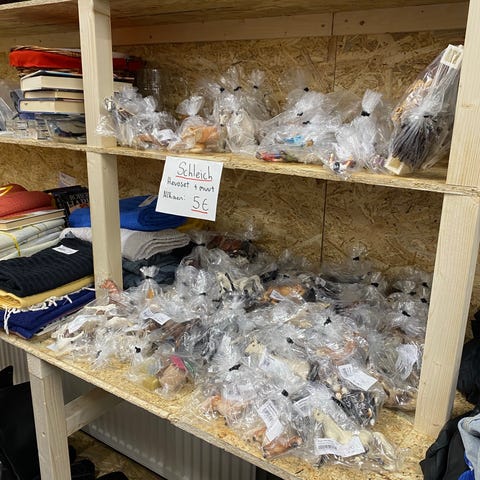 • paljon tarvikkeita (ruoka-astioita, ämpäreitä, harjoja, heiniä, vihanneksia ym.)