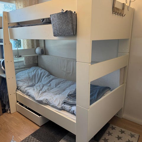 Myydään tukeva, kokopuumäntyinen kerrossänky, jonka sänkyjä voidaan käyttää myös erikseen. Kokonaismitta: korkeus 140 x leveys 87 x pituus 208 cm. Tikkaat yläsänkyyn. Ei patjoja, mutta helpot hankkia, peruskoko 80x200 cm.