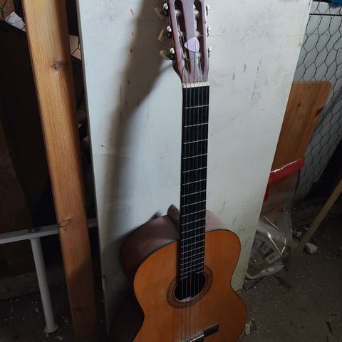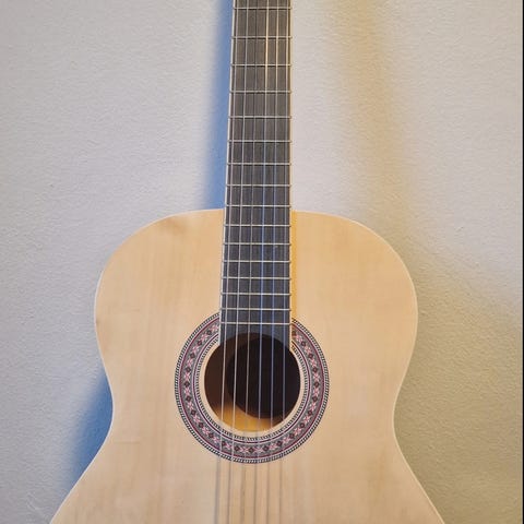 Akustinen kitara, kokonaispituus noin 88 cm. Runko on puuvärinen, kansi vaalea ja sivut sekä pohja tummemmat. Kaulassa on nauhat ja nailonkielet, ja virityskoneistot sijaitsevat avoimessa lapaosassa. Mukana tulee vetoketjullinen pehmeä kantopussi, jossa on etutasku pienten tarvikkeiden säilytykseen. Soveltuu kokonsa puolesta esimerkiksi lapselle tai nuorelle akustisen kitaran soiton harjoitteluun.