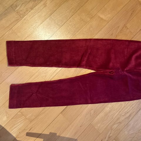 Nuppu Print Companyn punaisesta Sydäntalvi-joustocollegesta itse ommellut legginsit. Melko kapea malli, noin kokoa 122 cm. Ompelussa käytetty saumuria ja peitetikkikonetta. Lahjan suunnitellulle saajalle legginsit olivat pienet jo niiden valmistuessa eli näitä ei ole käytetty lainkaan. Kangas on esipesty ennen ompelua.
