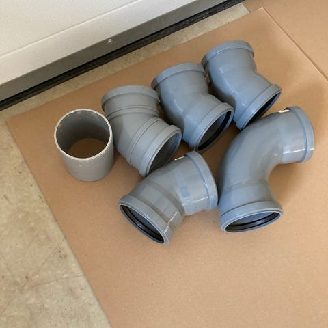 Kuvien mukaisia viemäriputkia ja niiden osia. Talon edellisiltä omistajilta jäänyt remonttien yhteydessä yli.