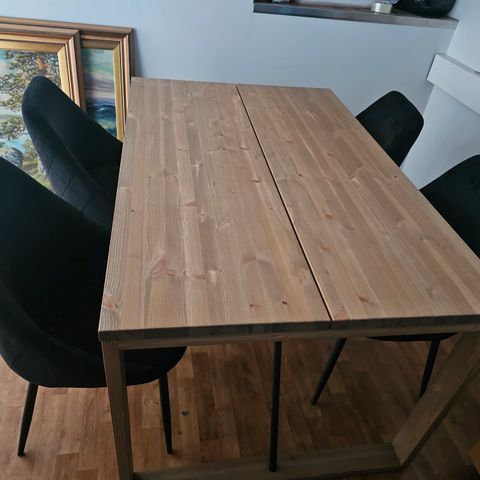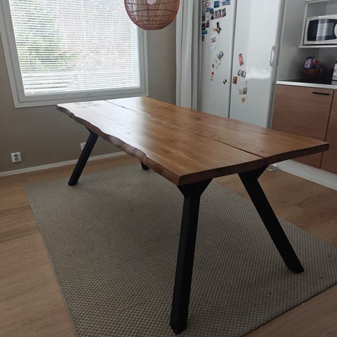 Puinen Vekestä ostettu musta Honka-lankkupöytä puisilla jaloilla. 90x180cm