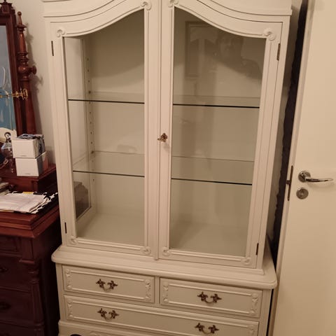 Hyvä kuntoinen ja kaunis valkoinen talonpoikaisrokokoo senkki myynnissä. Leveys 124cm, korkeus 60 cm ja syvyys 40 cm. Päällä irrallinen lasilevy. Kaksi laatikkoa ja kaksi kaappia, jotka toimivat kaikki hyvin. Kaapit saa lukkoon avaimilla.