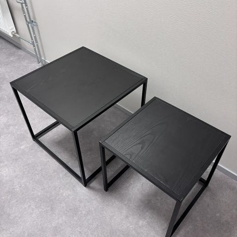 Materiaalit: valkoiseksi maalattu puu ja mattamustat metalliosat.