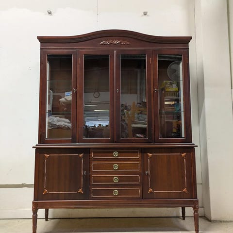 Hyvä kunto (7/10). Kaappi on ollut huolellisessa käytössä ruokasalissa astioiden, kristallien ja posliinien säilytykseen. Puuosat ja rakenne erinomaisessa kunnossa. Paino 100 kg kertoo massiivisesta laadusta.