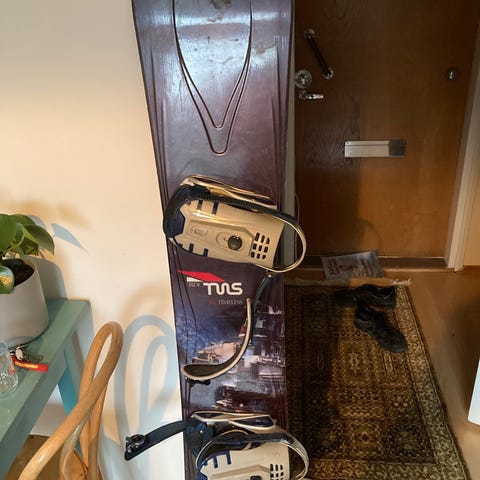 Pakettiin kuuluu 152 cm lumilauta, siteet ja kengät 43 koko.