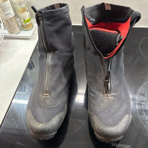 Diadora maantiepyötäilykengät, koko 44. Väri valkoinen mustin yksityiskohdin. Kengissä tarrakiinnitys ja solkikiristys. Pohjassa on spd klossit lukkopolkimiin.