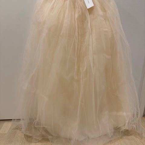 Kaunis beige hame, jossa hillityt koristelut sekä vyötäröllä että helmassa. Sivulla vetoketju, sisällä vuori. Kaunis laskeutuva helma.