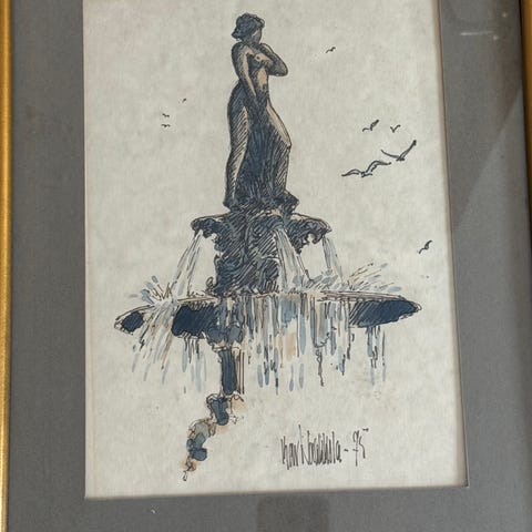 Henrik Tikkasen (1924-1984) mustekynäpiirustus Porvoon tuomiokirkosta - teos, jonka Henrik olisi heittänyt roskiin ellei äitini olisi sattunut paikalle. Tikkaset olivat naapureitamme Espoon Haukilahdessa vuosina 1963-67 ja teos on niiltä vuosilta (tarkkaa tietoa ei enää ole). Teoksessa on joku valkoinen maalitahra – kenties siinä meni jotain pieleen ja siksi Henrik oli teosta heittämässä roskiin. Koko 39,5 x 27,5 cm. Ikäisekseen hyvässä kunnossa.