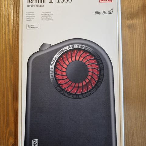 DEFA Termini II 1200 sisätilalämmitin. Teho 1200 W. Väri musta punaisella ritilällä. Tarkoitettu ajoneuvon sisätilojen lämmittämiseen. Pakkauksessa lämmitin, kiinnitystarvikkeet ja käyttöohjeet.