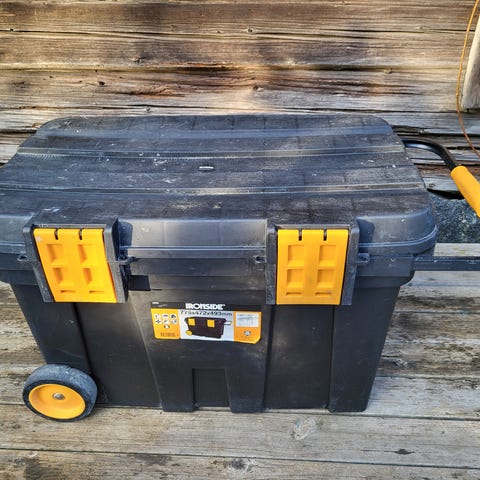 Vedettävä iso työkalupakki. Varsin karussa kunnossa, mutta hoitaa hommansa. Ulkomitat n. 50 x 50 x 75 cm. Vetokahvana patenttiratkaisu ja saranoiden kohdalla muovi murtunut.