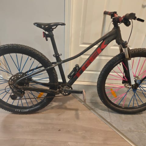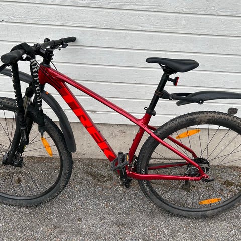 Trek lasten maastopyörä 27.5 renkailla. Pyörässä on etu- ja takalokasuojat, etujousitushaarukka sekä seisontatuki. Rungon muotoilu on suunniteltu lapselle sopivaksi, ja pyörä soveltuu maastossa ja hiekkateillä ajoon. Kesä ja talvirenkailla! Yhdellä käytössä ollut!