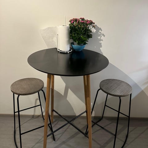 Siistissä kunnossa oleva Ikeasta viime vuonna ostettu korkea pöytä, sekä tuolit. Sopii hyvin pieneenkin asuntoon esimerkki ruokapöydäksi.