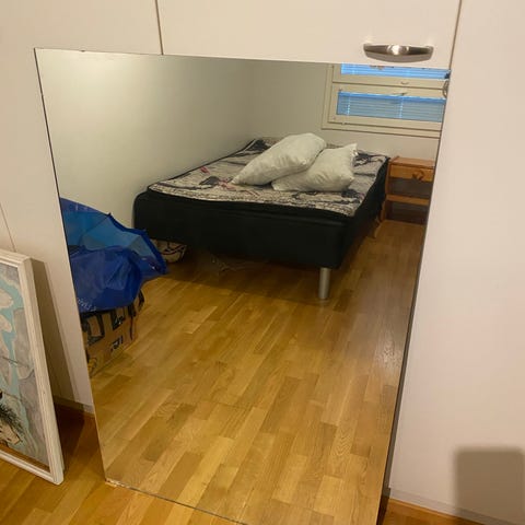 Vanha MK kuvastimen (Mäkisen kuvastin) peili, koko 130 x 72 cm. Kunto on oikein hyvä. Painava ja tukeva, kehys ilmeisesti jonkin sortin jalopuuta.