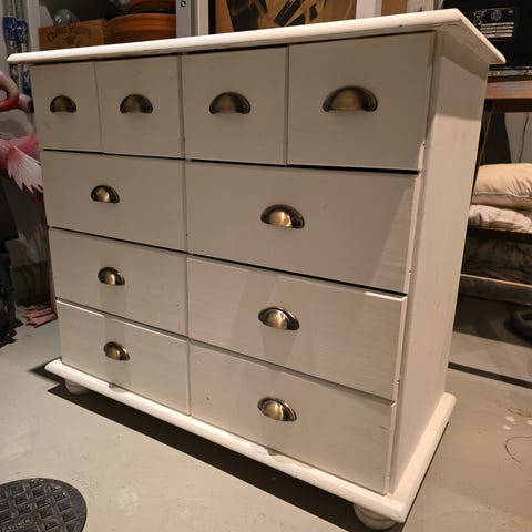 Sinisävyinen lipasto, 91x42x82,5cm (leveys×syvyysxkorkeus). Lipaston päällystaso saattaa irrota nostettaessa mutta ei vaikuta käyttöön. Tasossa pientä käytön jälkeä. Koiratalous.