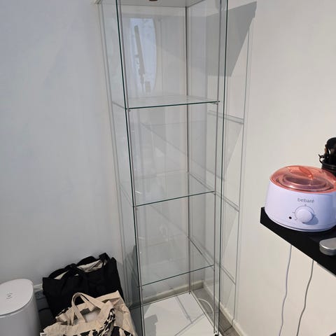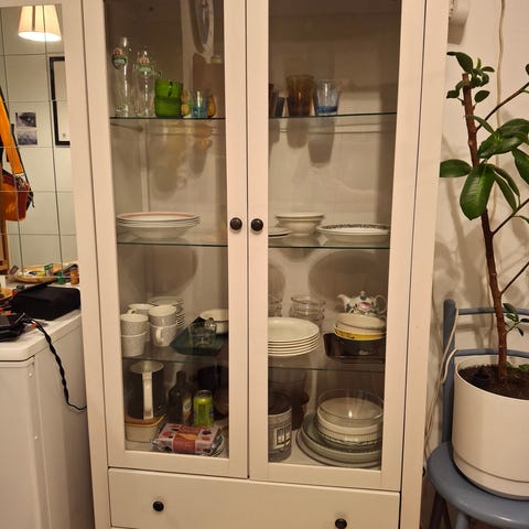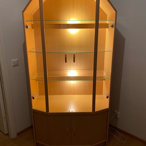 Muuton tieltä, uutta vastaava vitriini lasikannella, alaosassa tilava laatikko. Vain nouto. Omat kantajat.