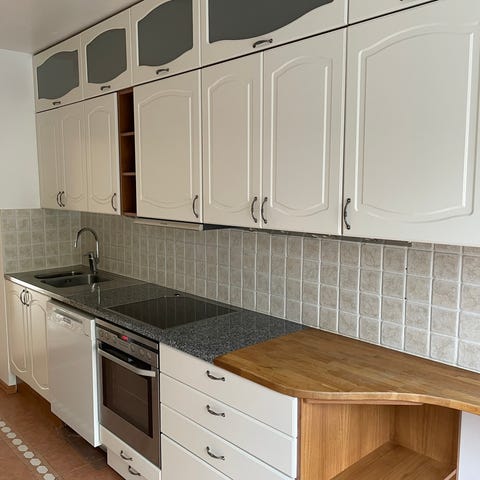 Keittiö sisältää rungot, kaapit, tasot ja halutessaan saa lieden myös. Kaapit on aiemmin maalattu, mutta on siistissä kunnossa. Tasot ovat olleet muutaman vuoden käytössä ja ovat myös hyvässä kunnossa.