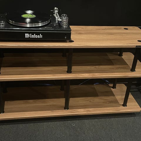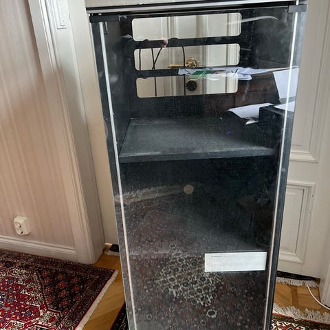Stereo taso /räkki. Alimmalla vinyylilevyt, Keskitason päälle vahvari + dekki, päällä taso soittimelle. Oven Kätisyys vaihdettavissa. Levytilassa ei väliseiniä. Pyörät alla.