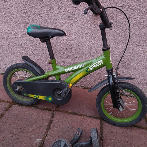Lasten polkupyörä missä uudet renkaat. Mukaan irrotettavat apupyörät. Pyörässä on jalkajarru takana. Voin nouto.