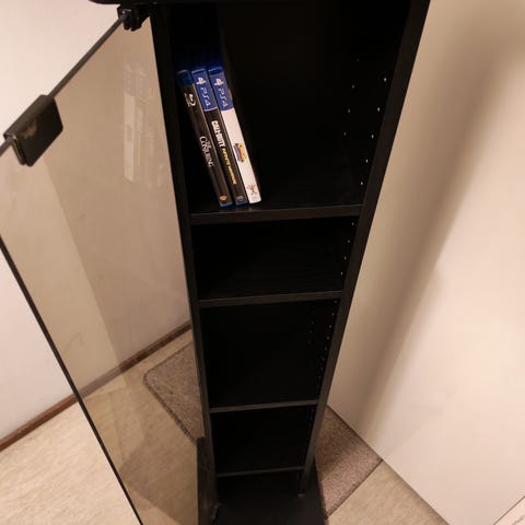 Annetaan cd teline. Syvyys 37cm, korkeus 117cm, leveys 17,5cm. 7 tasoa, 22cd/taso mahtuu yht. 154kpl.