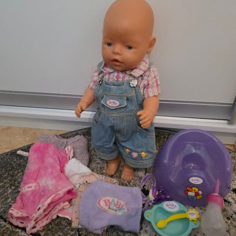 Baby Born nukke ja tarvikkeet. Kokonaisuuteen kuuluu nukke rattaissa sekä useita vaatteita ja hoitotarvikkeita. Nukke itkee painamalla rintakehästä kun on juottanut ensin vettä.