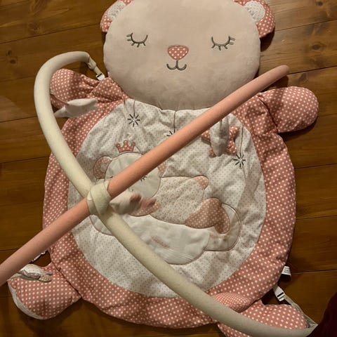 Leikkimatto säädettävillä kaarilla, joissa usempi ripustuskohta leluille sekä soiva lintu. Pesty hajusteettomalla pesuaineella. Savuton koirakoti.