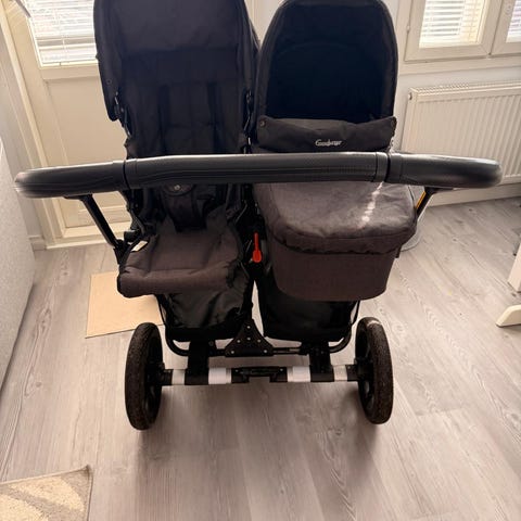 Bugaboo tuplarattaat. Toimii yksilövaunuina sivukorin kanssa sekä tuplavaunuina. Kokonaisuudesta uusittu osia vuosien varrella, osat siis eri vuosimalleja.