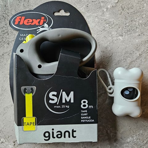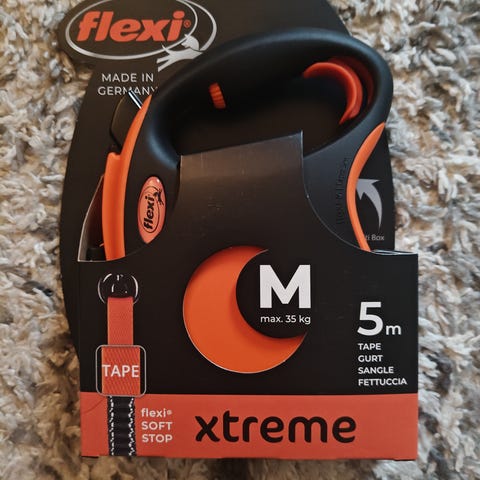 Täysin toimiva koiran flexi, kahvaa voi säätää, kakkapussikotelon saa mukaan ja tuollaisen kahden koiran jakojutun, jos haluaa, siinä vaan haljennut tuo yksi kohta ( kts kuva).