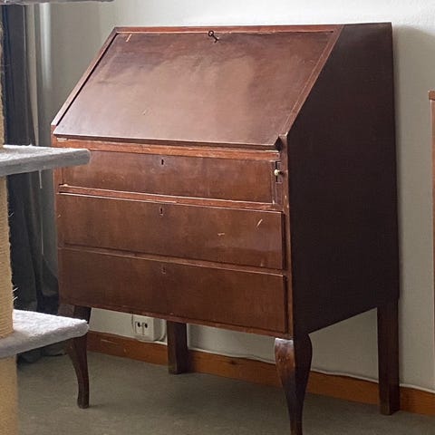 Vanha täyspuinen klaffilipasto. Toimii myös kirjoituspöytänä. Valkoiseksi maalattu. Kunto muuten hyvä, mutta maalipinta voisi olla parempikin. Avain tallella ja lukko toimii.