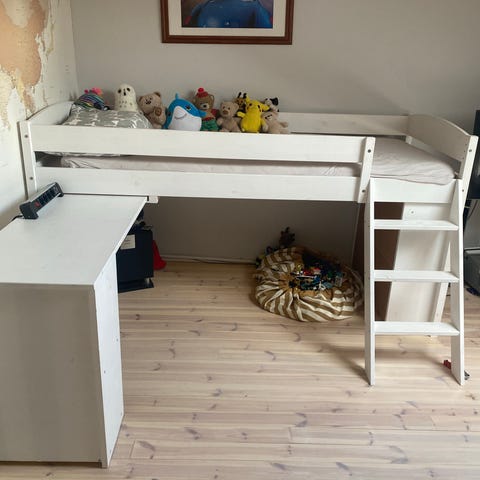 Unipuu Pikkuparvi, jossa mukana sivusta vedettävä pöytäosa. Kunto erittäin siisti, ei koloja, puremajälkiä tai syviä naarmuja. Lähinnä portaiden yläpäässä pientä tummumaa.
