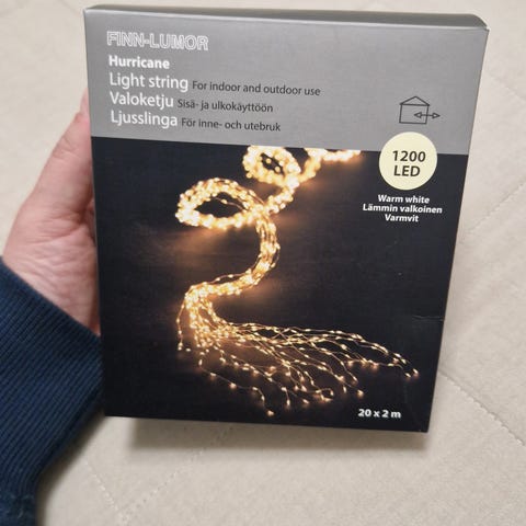 Aurinkokennolla latautuva valosarja. Kätevä esim. puutarhassa, päivällä latautuu ja hämärän tullen syttyy. Hämäräkytkin, vilkkukytkin, pois päältä kytkin.