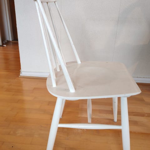 Puiset tosi jämäkät tuolit. Istuinosien lakka hyväkuntoinen. Rungossa läpikuultava vihertävä sävy, jossa muutamassa kohtaa väri kulunut. Saa tarvittaessa uudelleen käsiteltynä siistimmät.