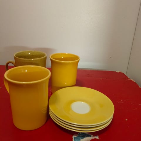 Arabia mukit. Kaksi valkoista teekuppia ja yksi vihreä muki kahvikuppi, materiaali keramiikka. Hinta kaikille yhteensä.
