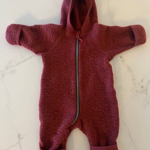 Ruskovilla villahaalari vauvalle, koko 62. Väri beige ja materiaali 100 % villa. Unisex-mallinen haalari, jossa vetoketju edessä helpottamassa pukemista. Sopii käytettäväksi vauvan lämpimänä pitävänä välikerros- tai yöasuna. Kuvissa mukana myös tumput ja myssy, jotka kuuluvat settiin.