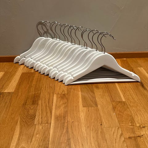 Lasten puiset henkarit, 17kpl. Kahdessa vaaleanpunaisessa maali kulunut, muut hyvässä kunnossa.