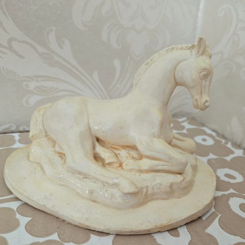 Musta, painava hevos aiheinen patsas. Pohjassa erottuu vuosiluku 1984. Venäjältä.