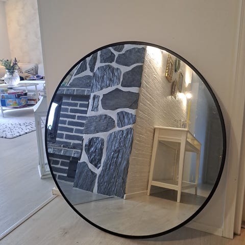 IKEA pyöreä peili mustalla kehyksellä. Peilissä on leveä, pyöreä kehys ja se soveltuu esimerkiksi olohuoneeseen, eteiseen tai makuuhuoneeseen sisustuselementiksi ja käyttöpeiliksi. 70cm.