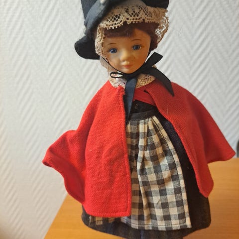 Kansallispukuinen nukke, jolla on punasävyinen hame, esiliina ja musta liivi. Nukeilla on vaalea pusero, punainen huivi kaulassa ja suuri olkihattu. Hiukset on muotoiltu kahdelle letille. Sopii keräilynukeksi tai sisustusesineeksi.