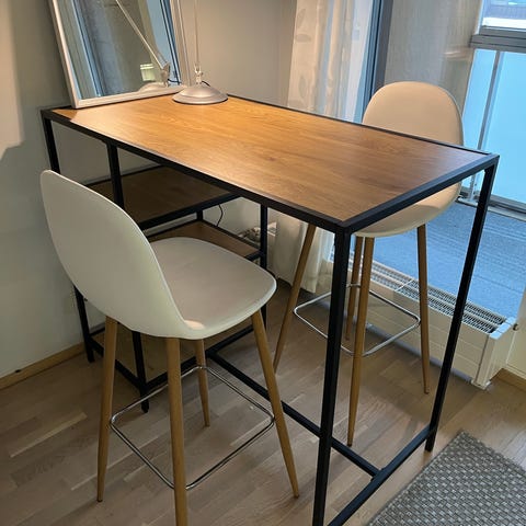 Muuton tieltä myyntiin erittäin hyväkuntoinen JYSKin baaripöytä sekä settiin kuuluvat kaksi baarituolia.