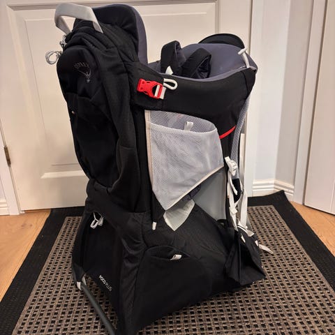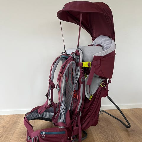 Hyvä, käytännöllinen ja mukava kantorinkka retkille ja ulkoiluun. Mukana aurinko-/sadesuoja.