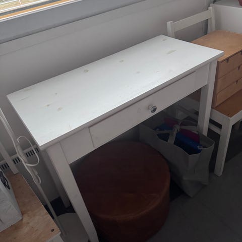 Jyskistä 3 vuotta sitten ostettu työpöytä. Muuten siisti, mutta pöytään ollut kiinnitettynä harmaa kangaspintainen äänieristelevy, jonka saa halutessaan kaupan päälle mukaan. Pöydässä siksi ruuvin reikien jäljet.