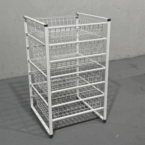 Elfa-merkkinen säilytyskori, jossa on monta vetolaatikkoa. Kori on valmistettu valkoisesta metalliverkosta ja siinä on mustat kulmasuojat.