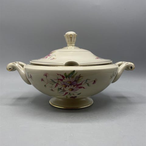 Arabia Maire kulho, jossa on kauniit kukkakoristeet ja kultaiset yksityiskohdat. Kulhossa on kaksi kahvaa ja kansi.