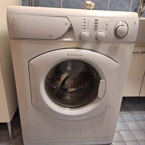 Vanha kone, mutta toimii ja pesee pyykin puhtaaksi. Pesuohjelmat aika pitkiä.
