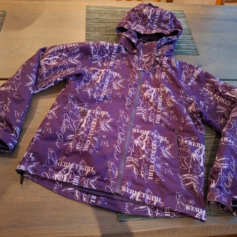 Ulkoilutakki jossa näppäreillä irroitettava huppu. Käytetty kunto. Vetoketjut toimivat ja helman kuminauha kunnossa. Polyamidi ja polyesteri materiaaleina.